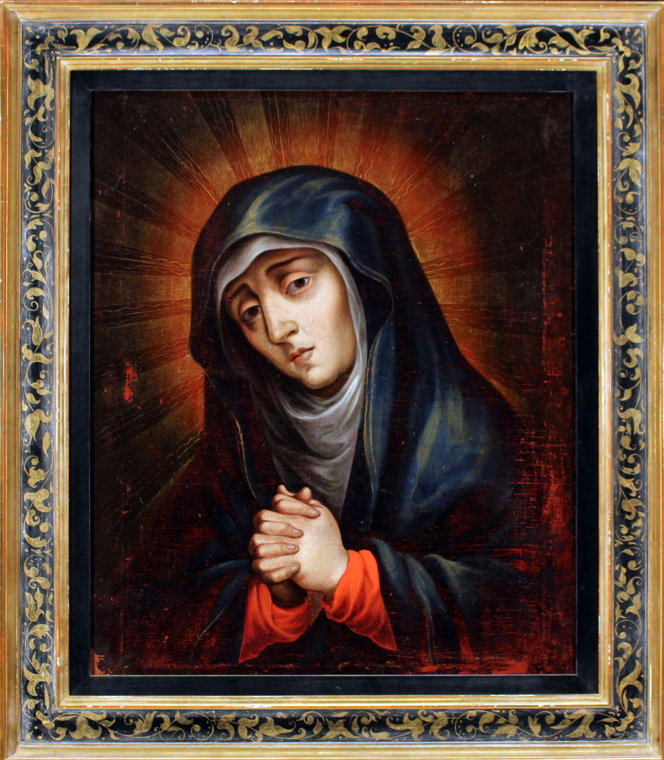 The principal biblical references to Mary’s sorrows are in Luke 2:35 and John 19:26-27— with one a symbolic reference about a sword piercing Mary’s soul and the other relating Jesus’ words to Mary and to the beloved disciples. Many early church writers interpret the sword as Mary’s sorrows, especially as she saw Jesus die on the cross; thus, the two passages are linked as a prediction and fulfillment. Many see Mary as sorrowful, but a powerful figure as she stood fearlessly at the cross while others fled. She was sorrowful about Christ’s suffering, yet understood his plan for salvation.