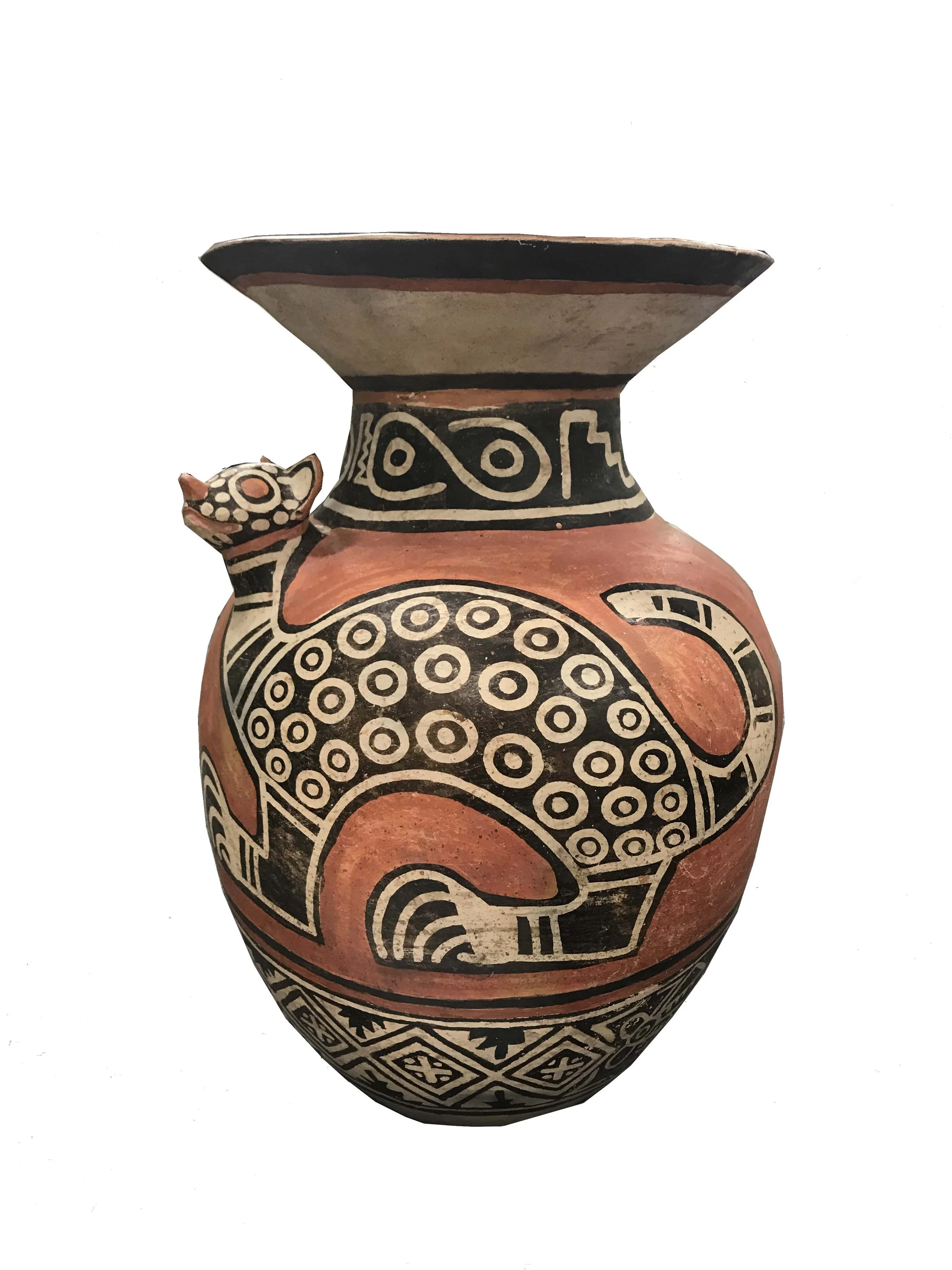 Las cerámicas del antiguo Perú se fabricaron utilizando procedimientos sencillos. Los alfareros trabajaban con materias primas fácilmente disponibles y con herramientas básicas para realizar obras extremadamente complejas. Los objetos de cerámica recuay incluían cuencos, tinajas con forma oblonga, botellas de doble pico y una variedad de botellas y tinajas con efigies que representaban seres humanos, animales, y elementos arquitectónicos. usaban los característicos colores negro, rojo, y blanco. Esta particular vasija recuay tiene un panel con una distinta figura de un “Animal lunar”, un panel de diseño geométrico y el venerado jaguar en toda la banda central. El jaguar representaba el poder, la ferocidad y el valor. También estaba asociado con la visión, lo que significa tanto su capacidad para ver durante la noche, como también para mirar en el interior de los oscuros rincones del corazón humano.